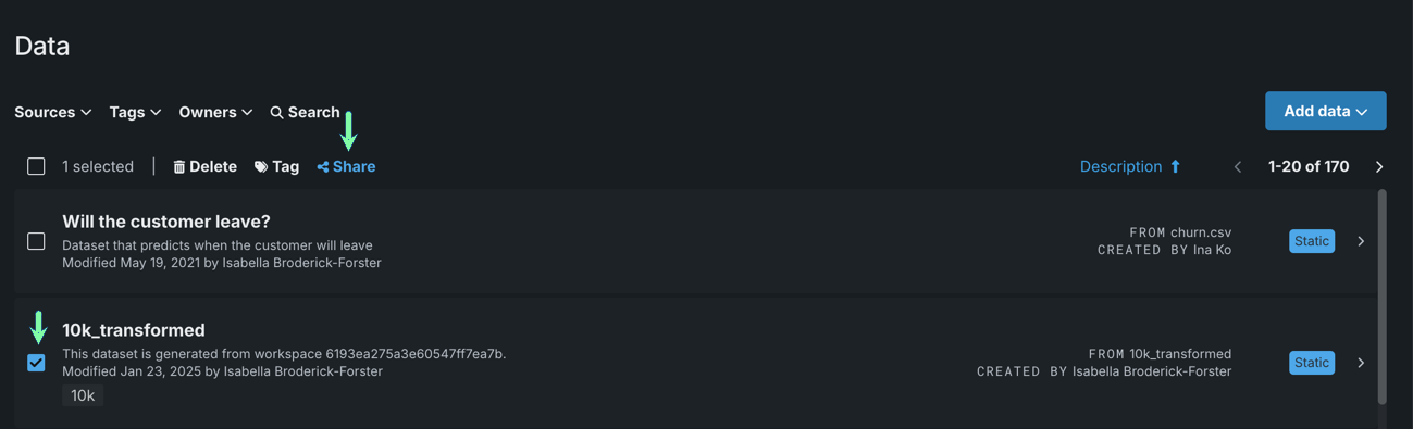From the Data Registry page, you can share individual datasets with specific users, groups, or organizations within DataRobot.