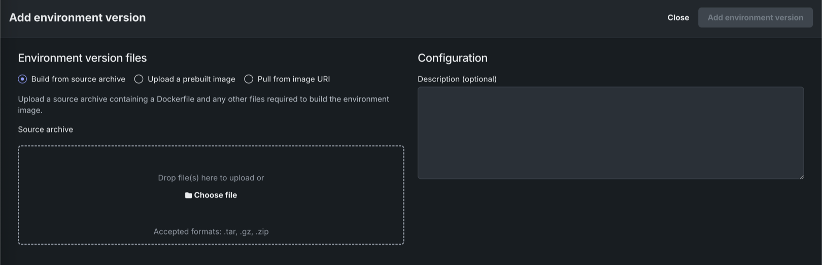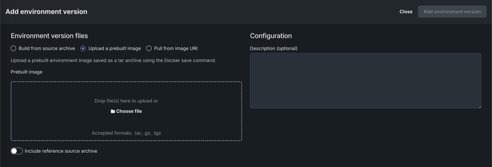 Upload a prebuilt image Provide a prebuilt environment image saved as a tarball using the Docker save command. Optionally, you can also click Include reference source archive to upload the source archive used to build the image for reference purposes. This source archive is not used to build the environment.