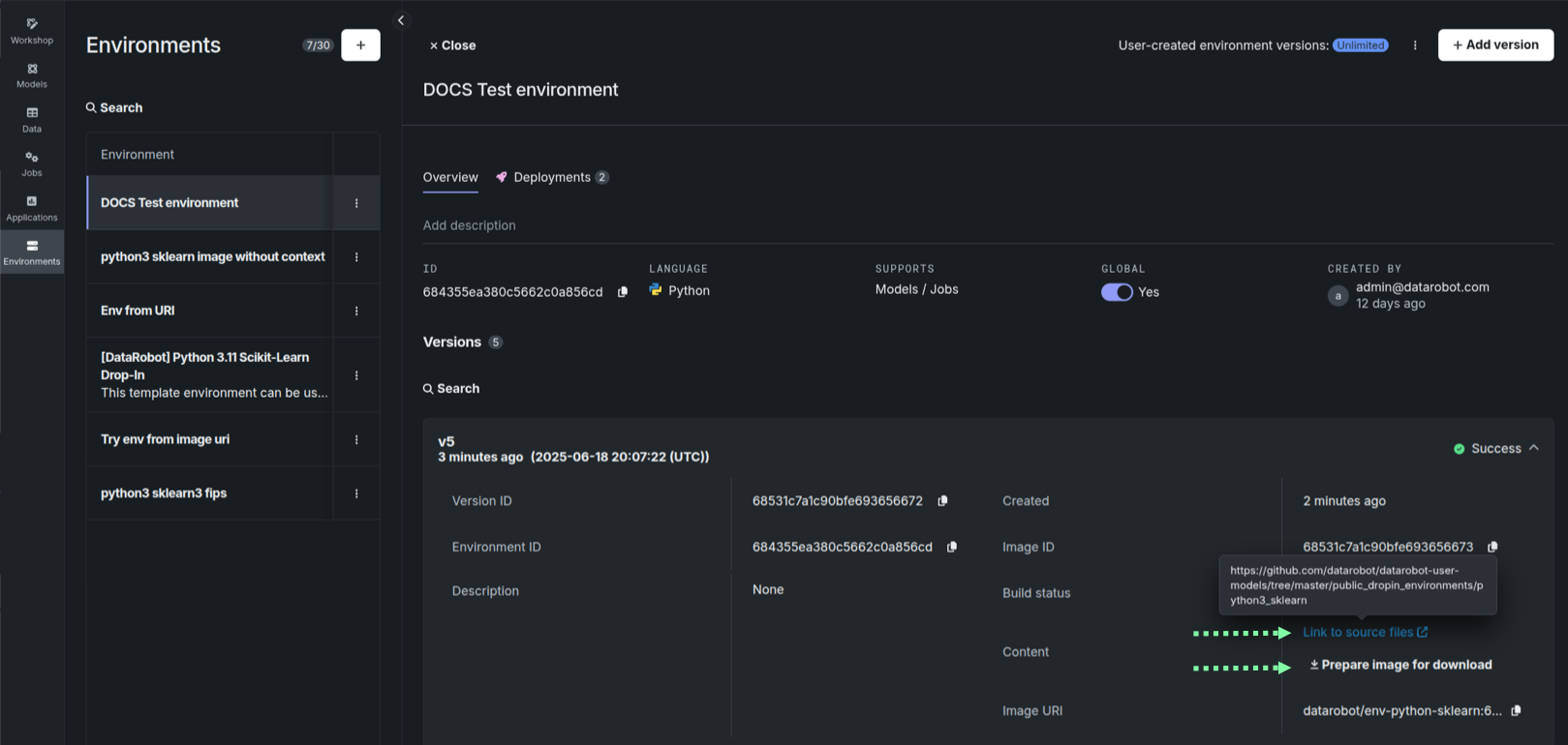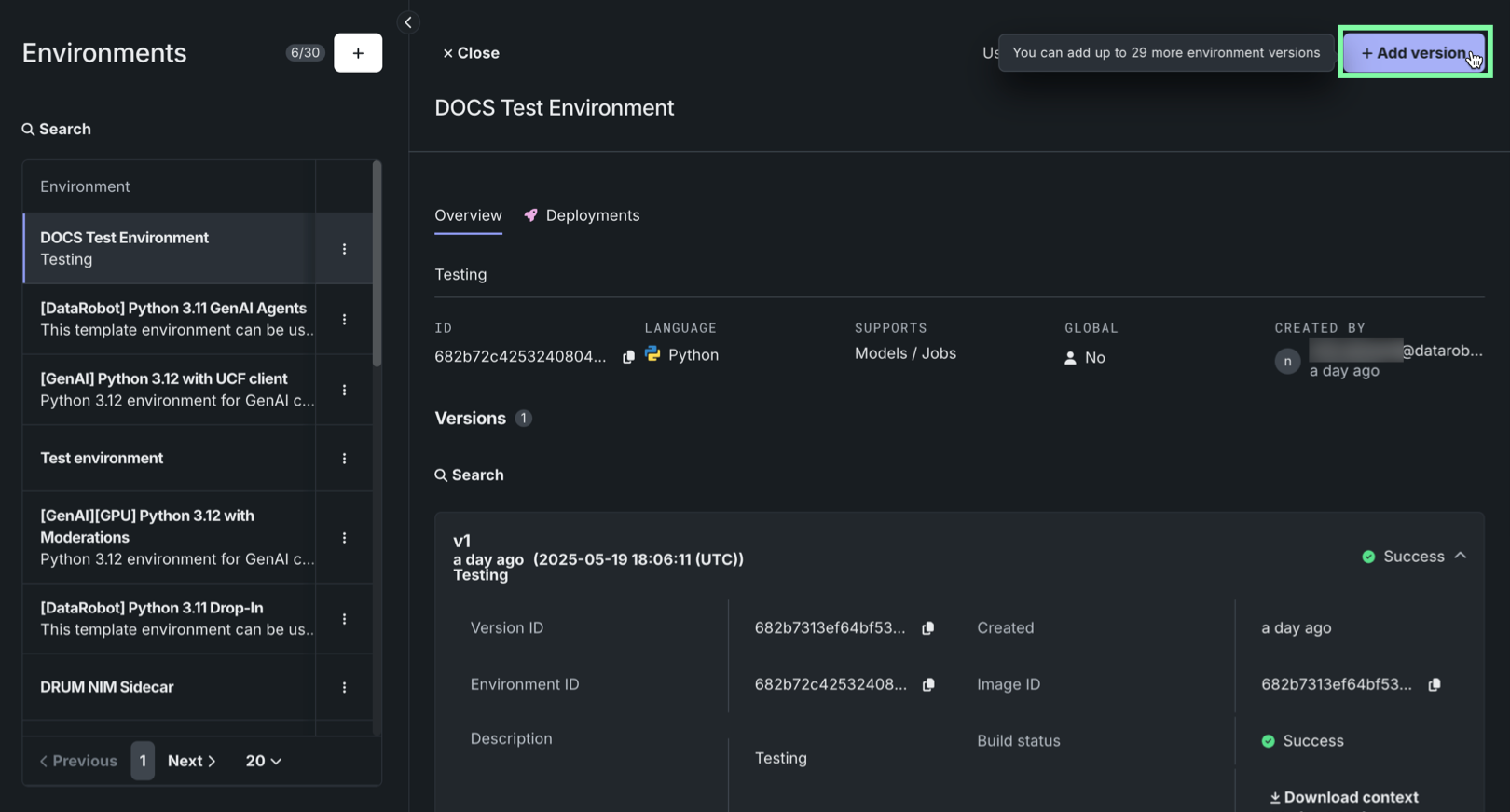 All past environment versions are saved, providing an accessible history of the execution environment. By default, when creating a model version, if the selected execution environment does not change, the version of that execution environment persists from the previous custom model version, even if a newer environment version is available. For more information on how to ensure the custom model version uses the latest version of the execution environment, see Trigger base execution environment update.