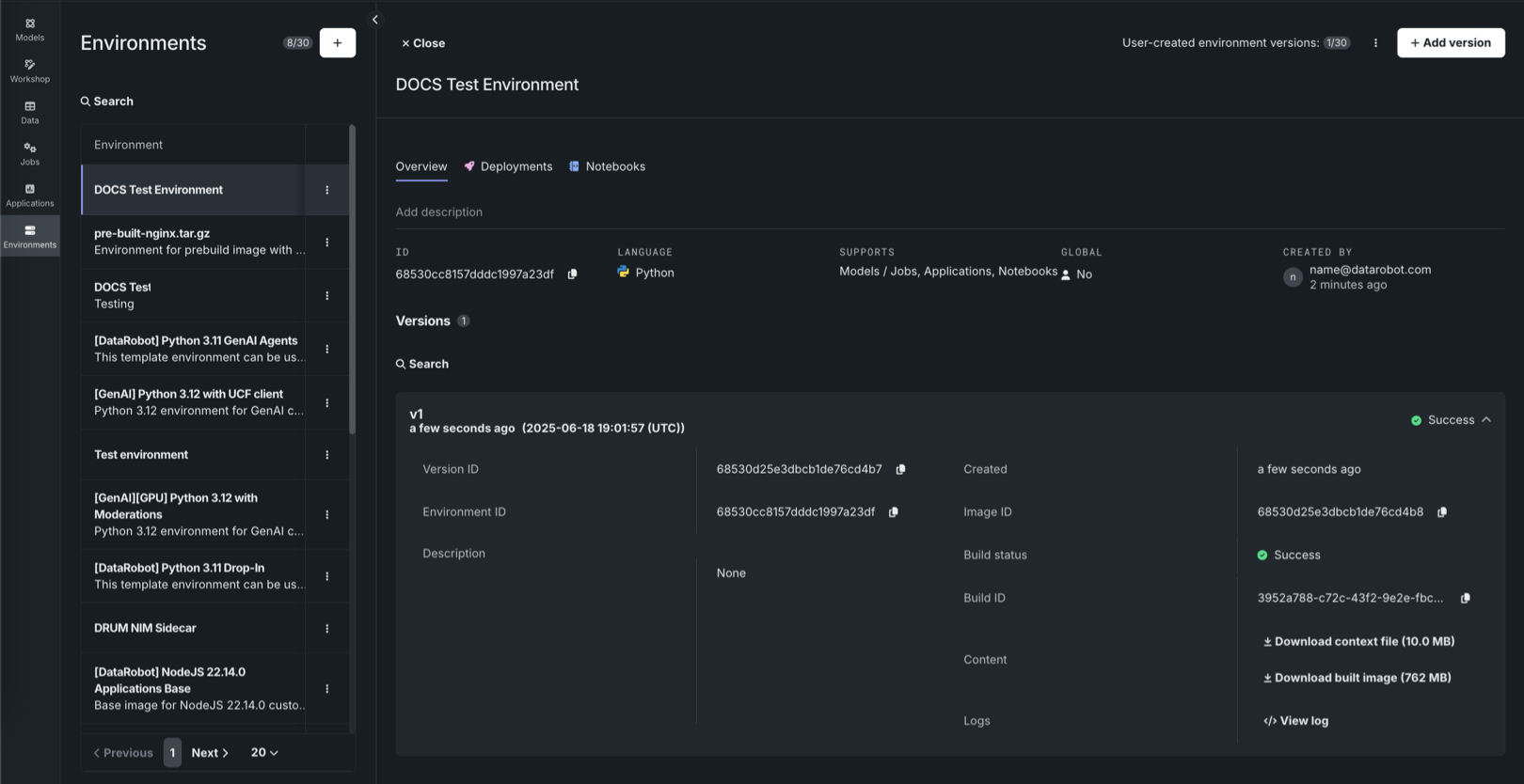Supports The DataRobot artifact types supported by the environment: Models and Jobs, Applications, and Notebooks.