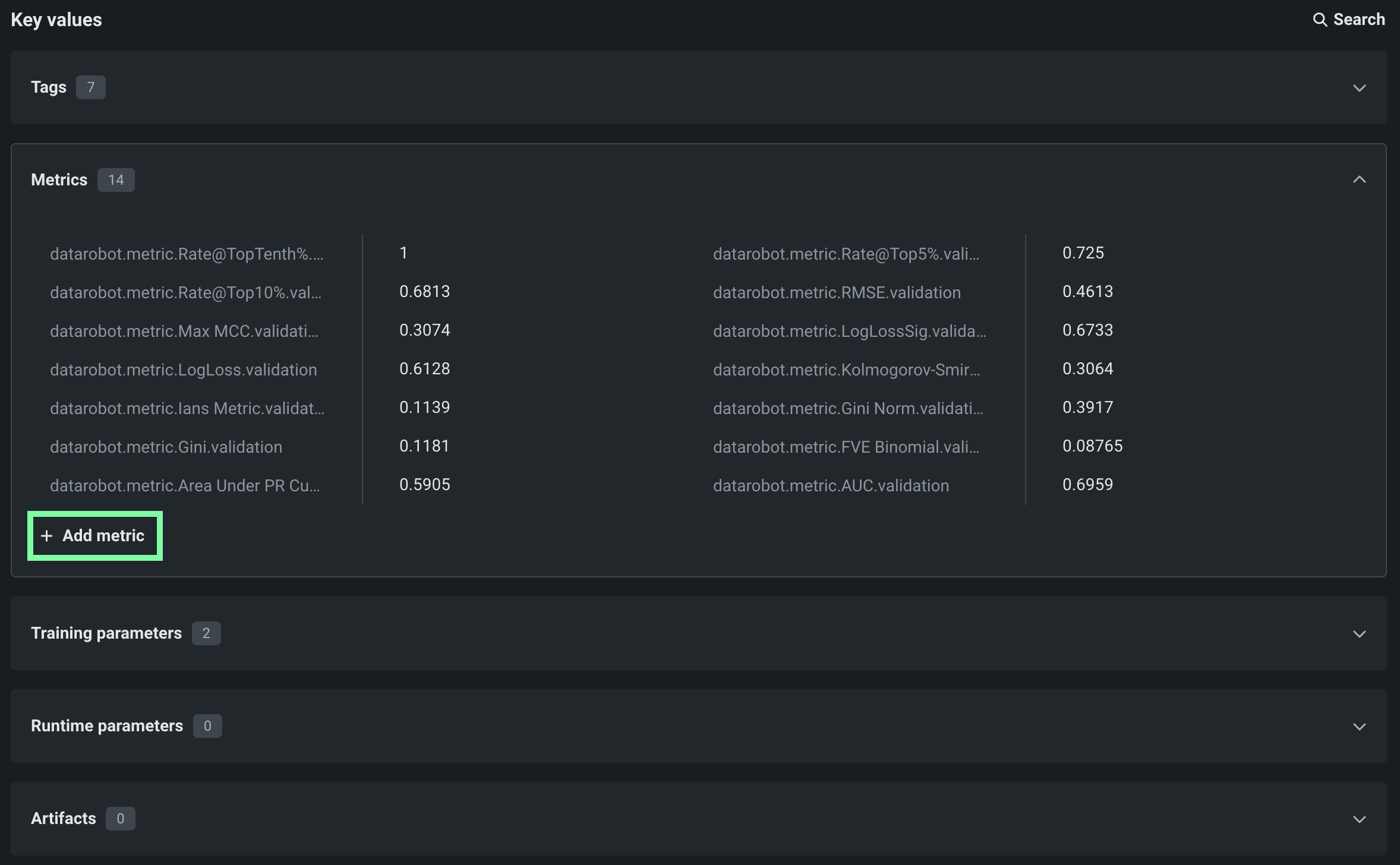 Browse the Tags, Metrics, Training parameters, and Artifacts sections to locate editable key values.