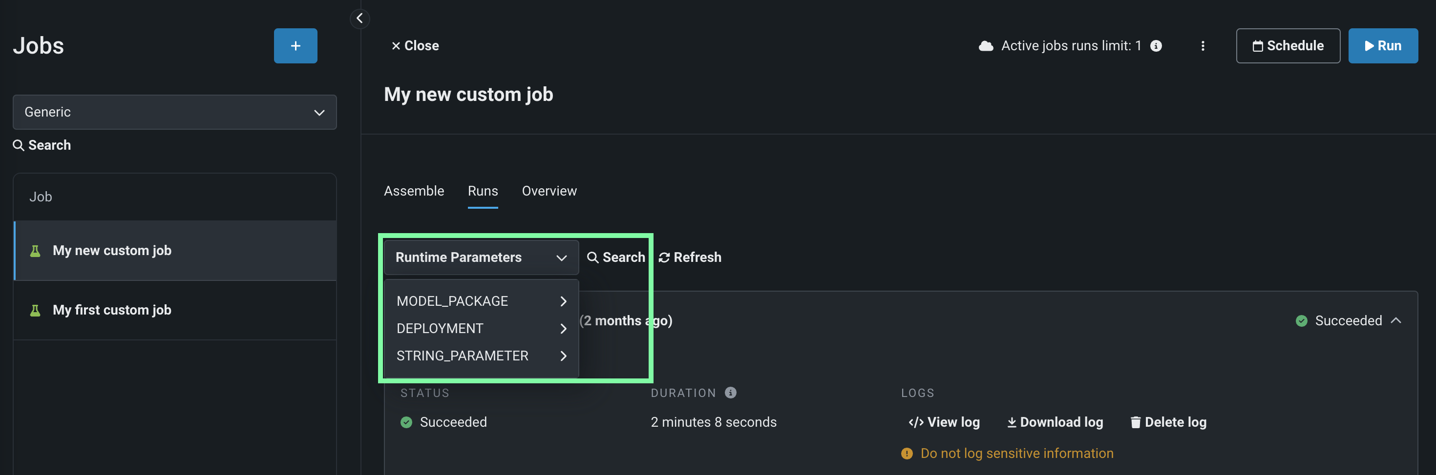 | Test run | Starts a custom job test run (with the DRY_RUN runtime parameter set to 1). This run does not report metric data to the deployment. Navigate to the Runs tab to view custom job run information. |