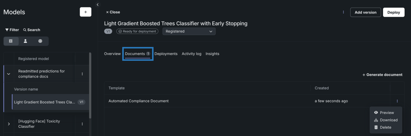 2. In the list of versions, click the version you want to generate compliance documentation for, opening the registered model version panel. Then, click the Documents tab.