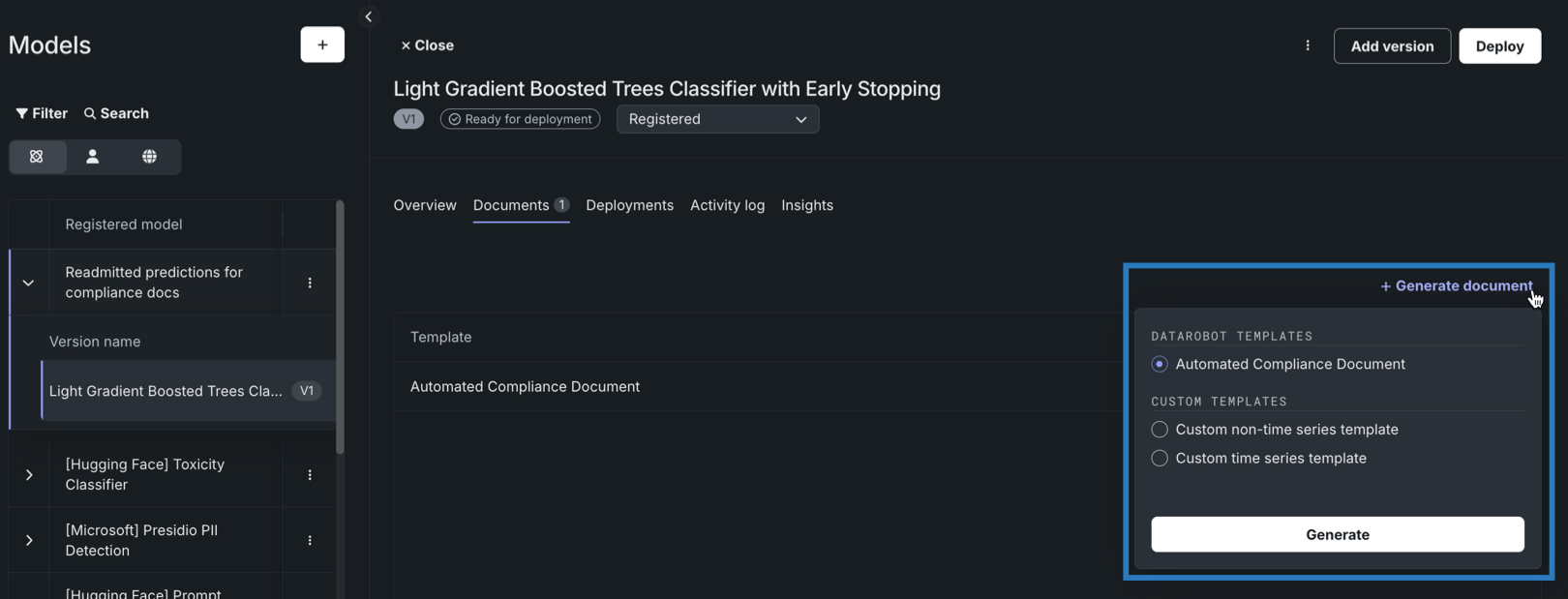 3. To generate a new document, click + Generate document, select a template from the DataRobot Templates or Custom Templates list, and click Generate: