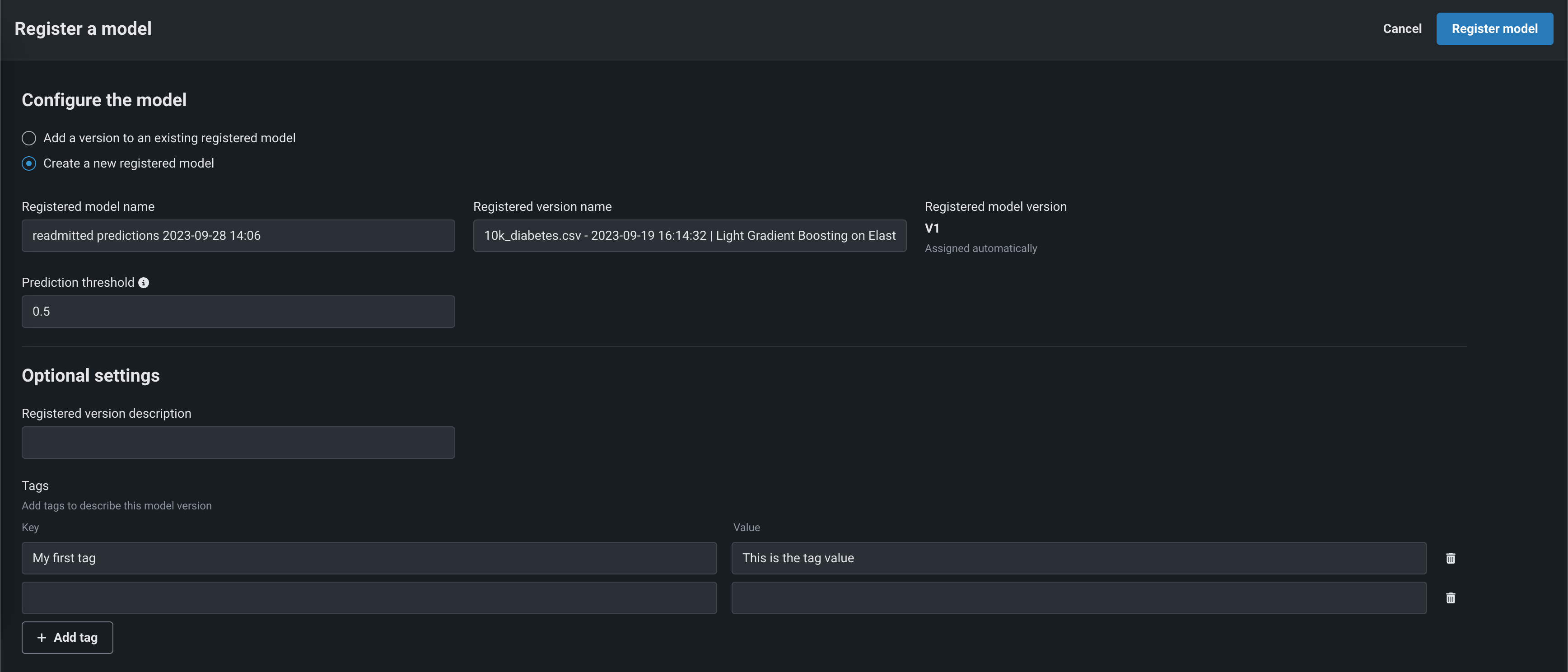 Registered version name Automatically populated with the model name, date, and time. Change or modify the name as necessary. Registered model version Assigned automatically. This displays the expected version number of the version (e.g., V1, V2, V3) you create. This is always V1 when you select Register as a new model. Prediction threshold For binary classification models. Enter the value a prediction score must exceed to be assigned to the positive class. The default value is 0.5.If necessary, you can configure the following Optional settings: