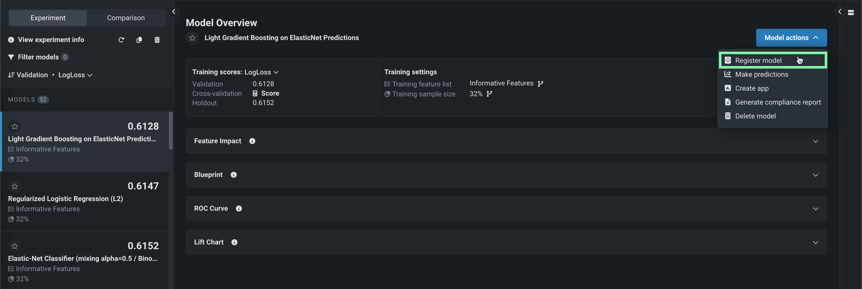 In a Workbench experiment, select the model from the Models list and then click Model actions > Register model: