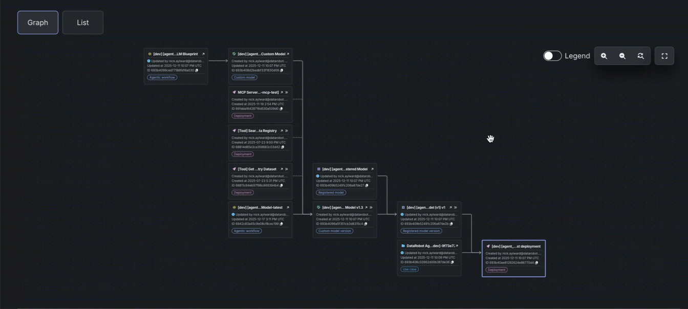 Graph: An interactive, end-to-end visualization of the relationships and dependencies between MLOps assets. This DAG (Directed Acyclic Graph) view helps audit complex workflows, track asset lifecycles, and manage components of agentic and generative AI systems. The graph displays nodes (assets) and edges (relationships/connections), enabling the exploration of connections and navigation through the asset ecosystem.