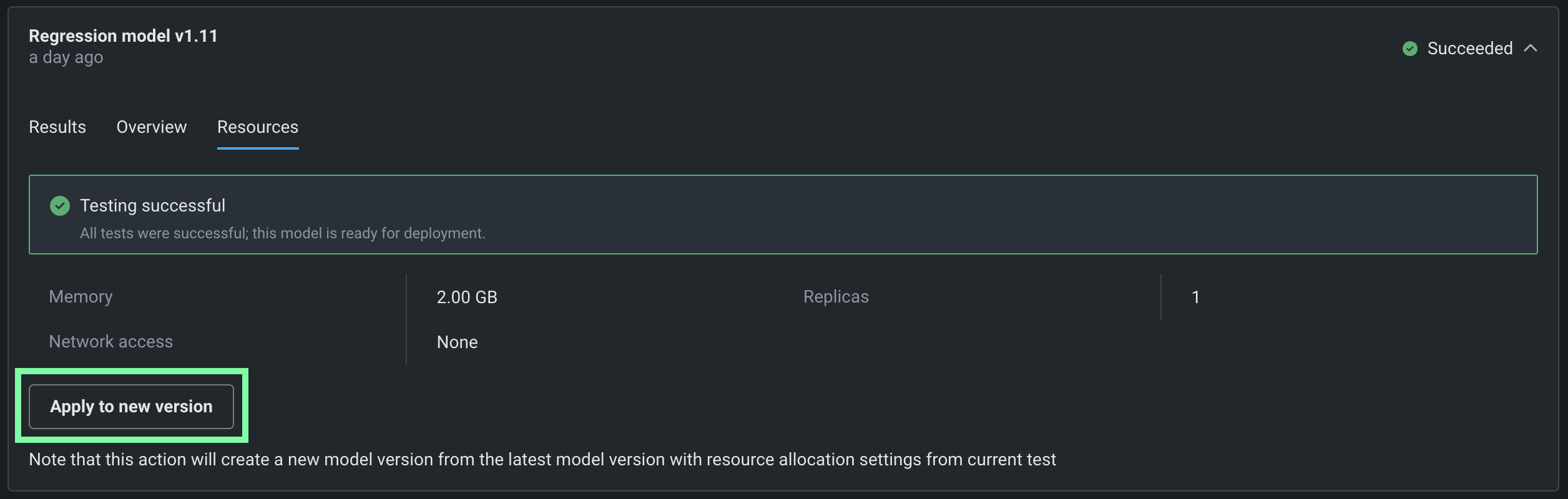 If you are satisfied with the test's configured resource settings, you can open the Resources tab and click Apply to new version to create a new custom model version with the resource allocation settings from the current test run.