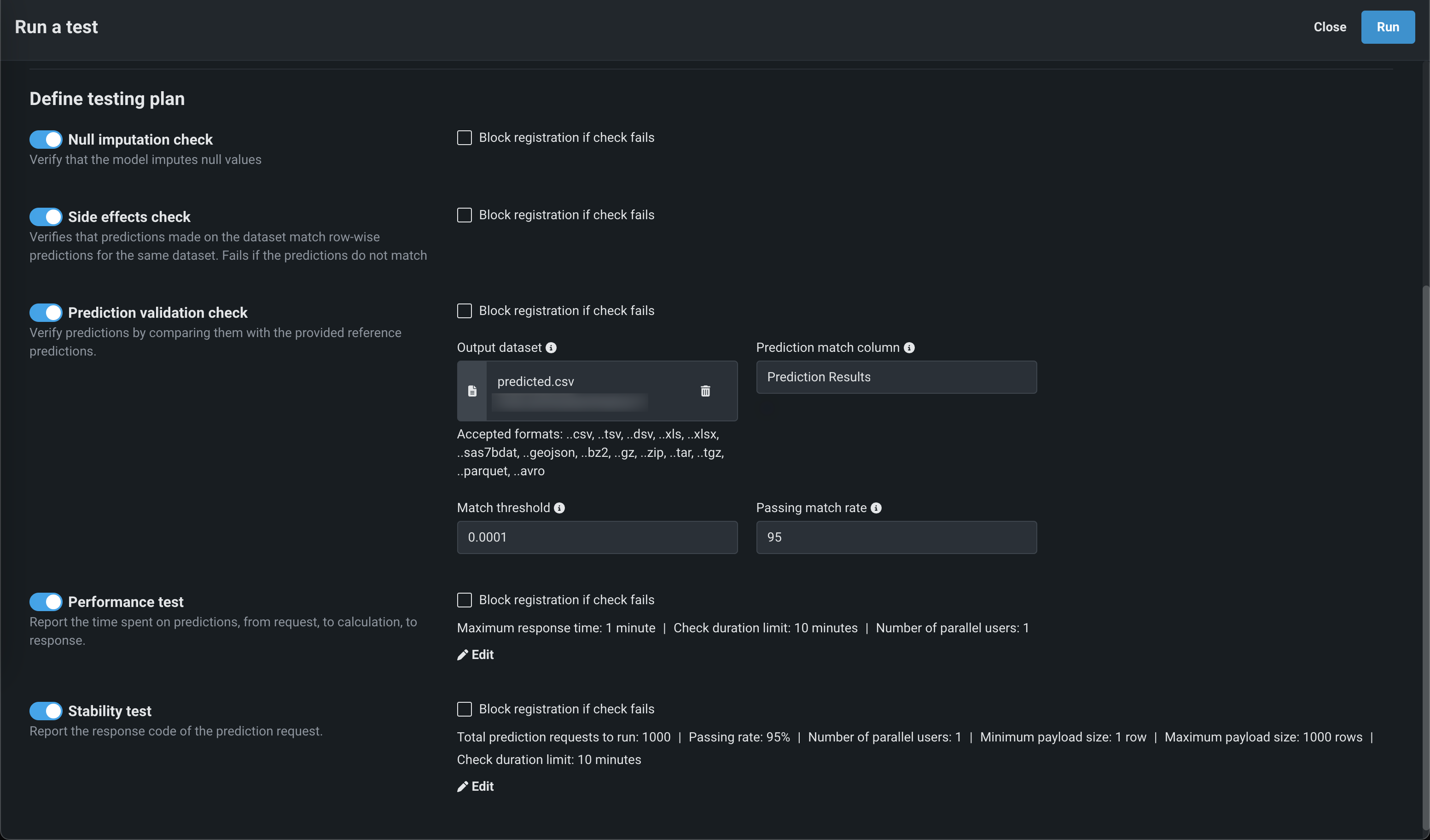 When a test is enabled, and the Block registration if check fails option is selected, an unsuccessful check returns an Error, blocking the registration and deployment of the custom model and canceling all subsequent tests. If this option isn't selected, an unsuccessful check returns Warning, but still permits registration and deployment and continues the testing suite.