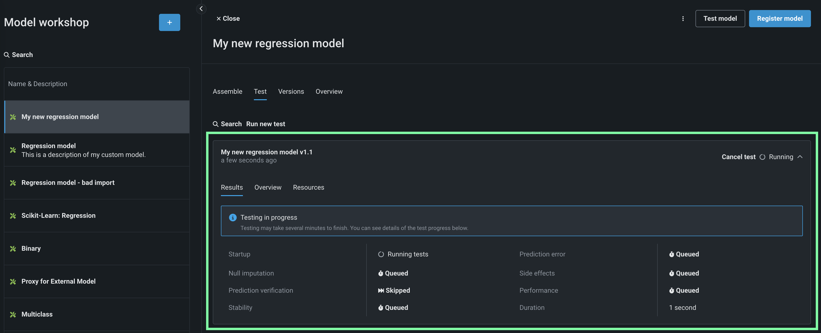 You can test custom models in the Workshop. Alternatively, you can test custom models prior to uploading them by testing locally with DRUM. Testing ensures that the custom model is functional before it is registered and deployed, using the environment to run the model with prediction test data.