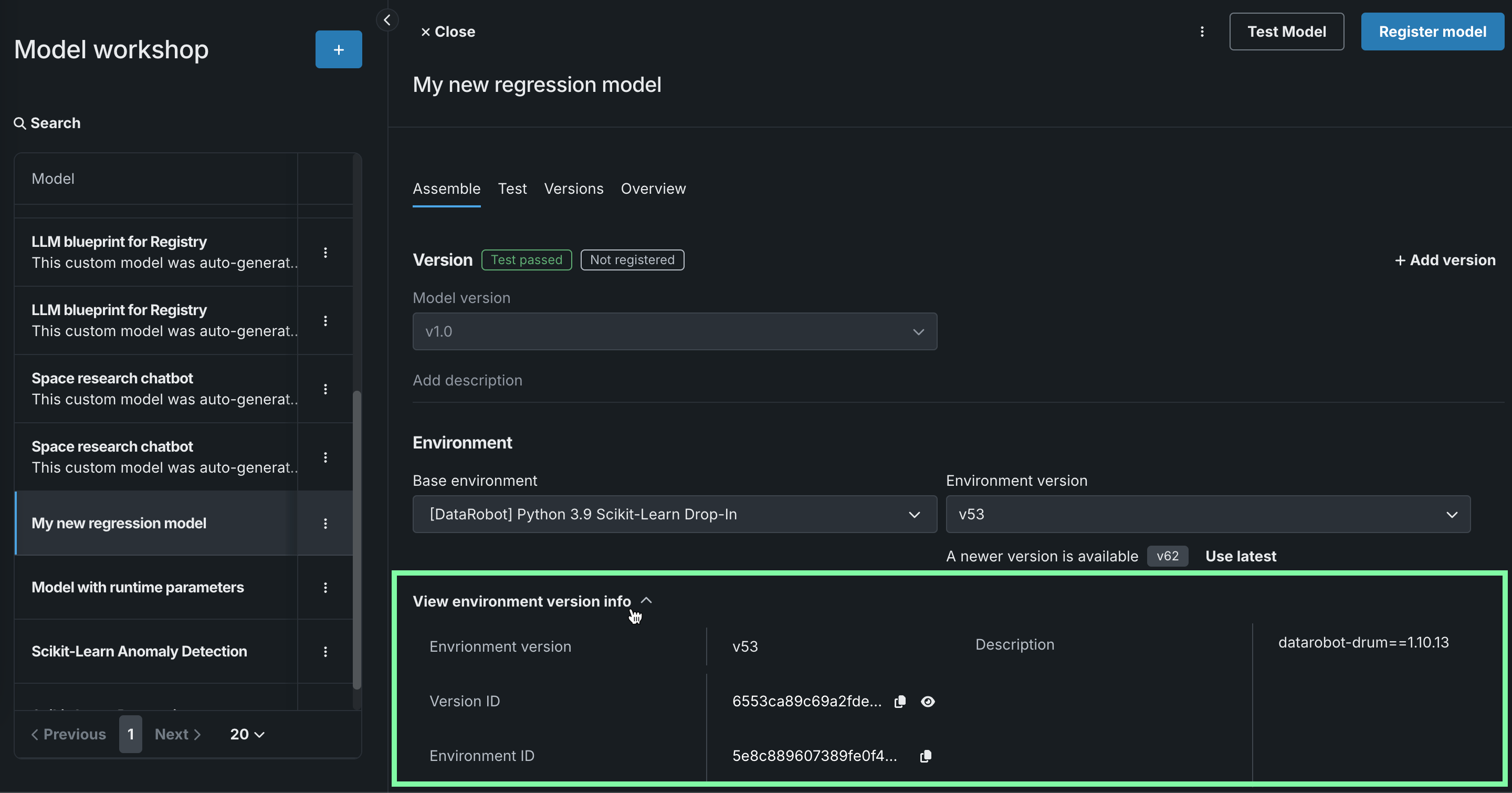 To view more information about the custom model's current environment version, click View environment version info to view the Environment version, Version ID, Environment ID, and Description.