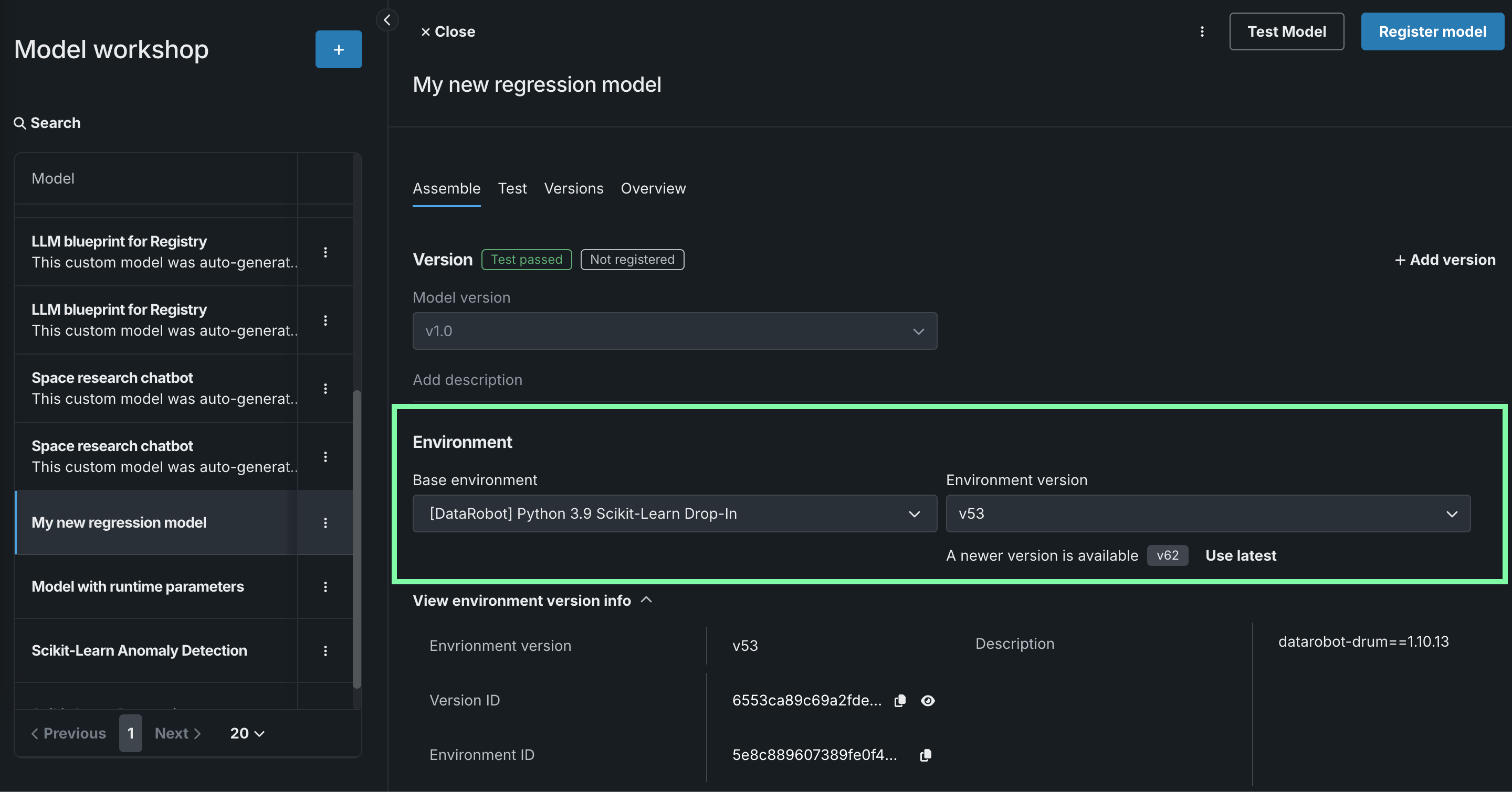 If a newer version of the environment is available, a notification appears, and you can click Use latest to update the custom model to use the most recent version with a successful build.