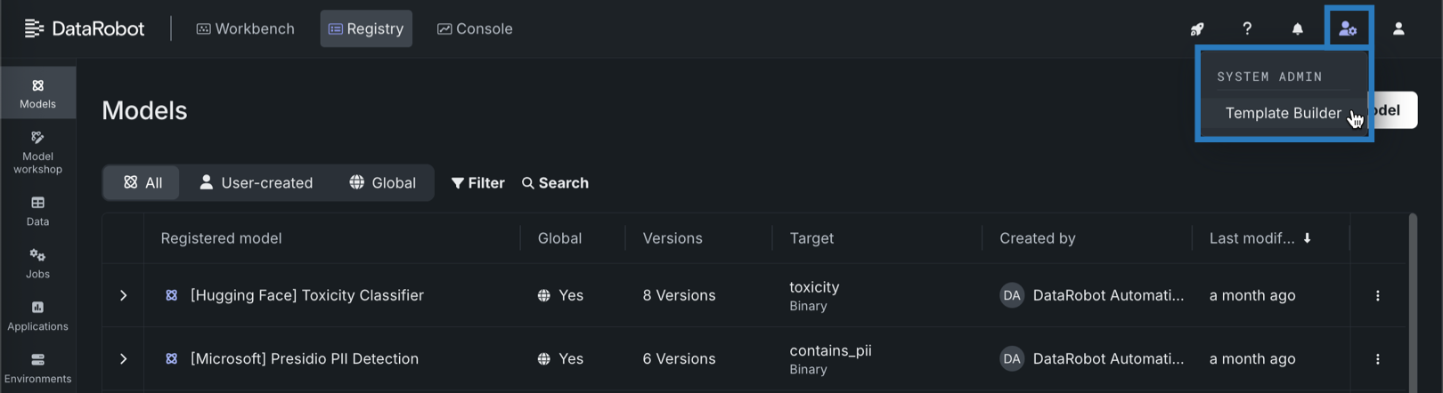 The Template Builder allows you to create, edit, and share custom documentation templates to fit your needs and speed up the validation process. Generate automated documentation using the provided compliance documentation template or create and share custom, user-defined templates that are more closely aligned with your documentation requirements. For a user with template administrator permissions, the template builder can be found in the upper-right corner of the application. To build compliance documentation templates, in the navigation bar, click the system admin icon , then click Template Builder.