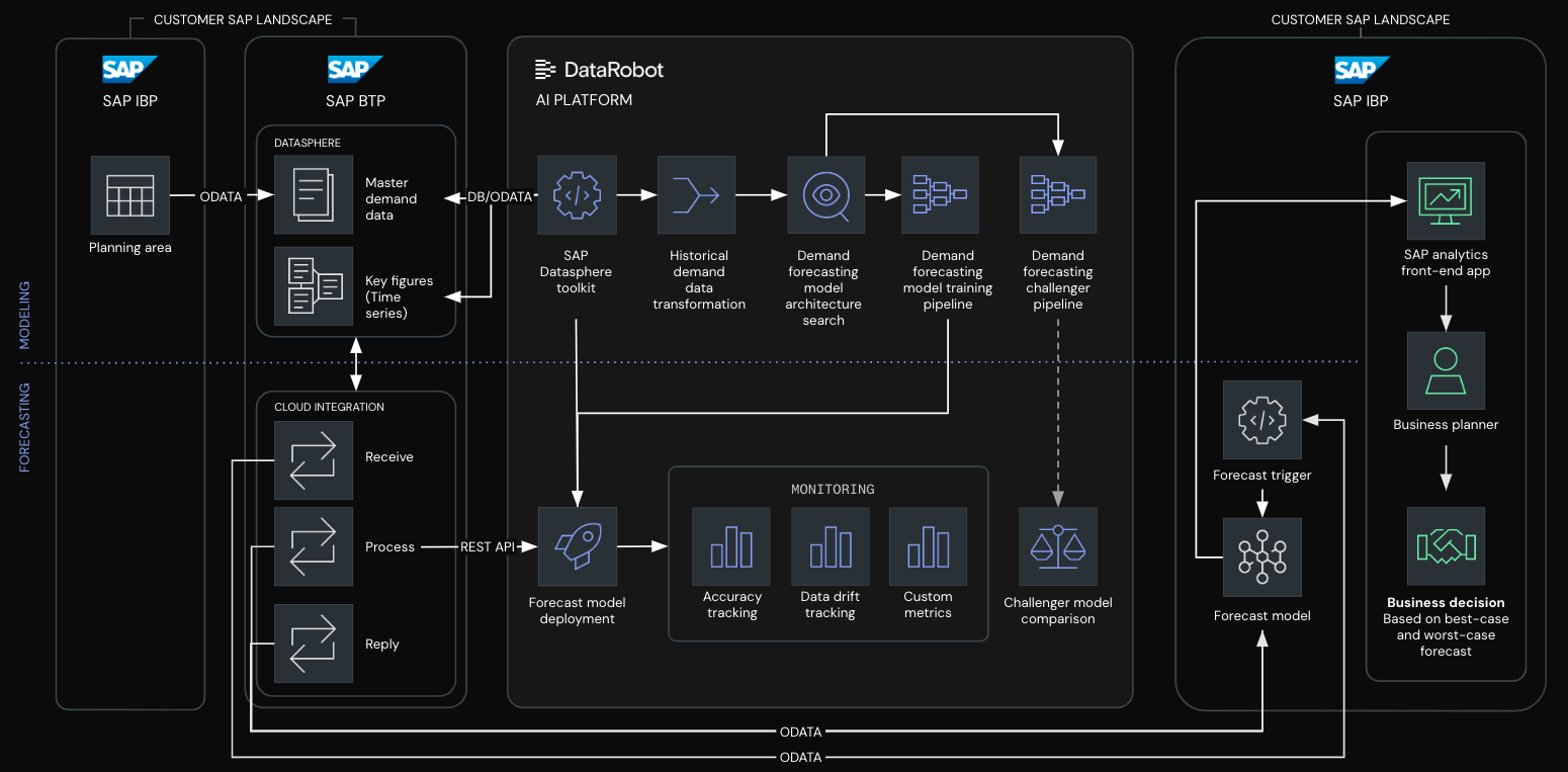 - Seamless SAP IBP integration: Connect via the SAP BTP Integration Suite to enable smooth data exchanges between SAP IBP and DataRobot’s external forecasting models.