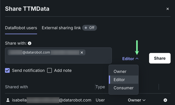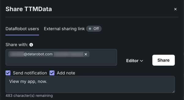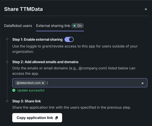 External sharing allows you to share custom applications with end-users who don't have access to DataRobot via a link. To share a custom app with non-DataRobot users: