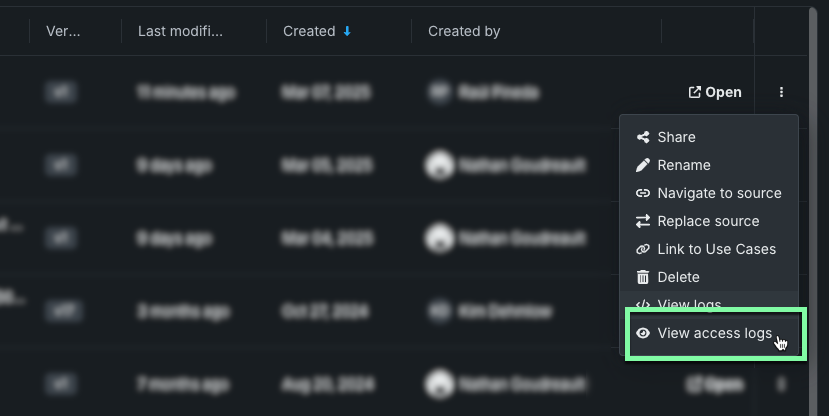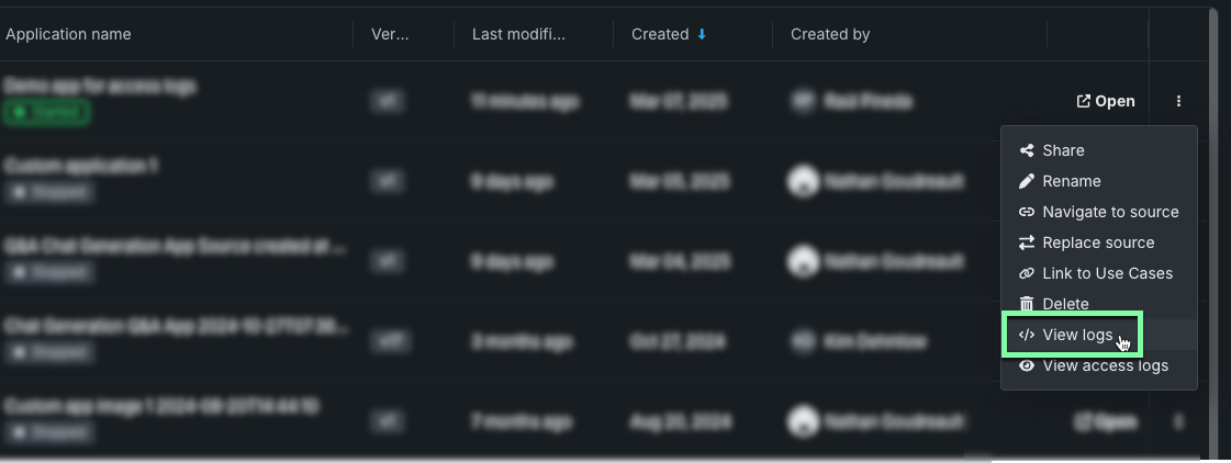 Browse access logs to monitor the history of users who have opened or operated a custom application. To view access logs, navigate to the Applications page, open the actions menu for the app you want to view logs for, and click View access logs.