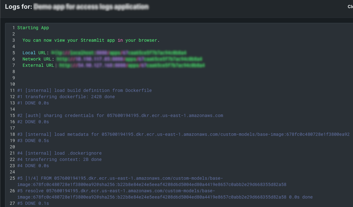 DataRobot records two types of logs for custom applications: build and runtime logs and access logs. Through these logs, you can monitor an application's build and runtime tasks and review the user access history for an application.