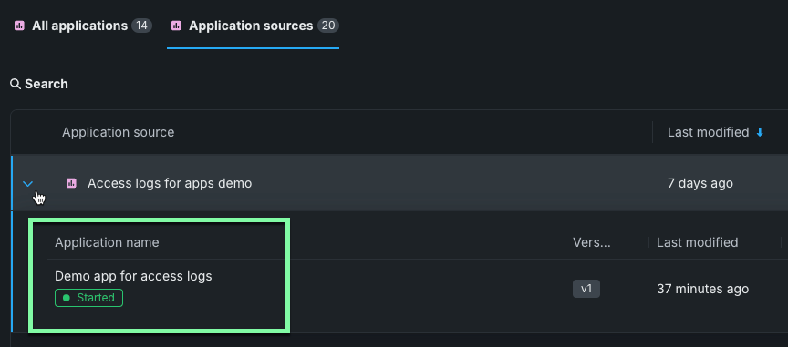 You can also view access logs directly from an application source. Navigate to the Application sources page, locate the application source for your custom application, and expand the dropdown to view the applications built from the source. Then you can click the custom application for which you want to view the access logs to access a detailed view.