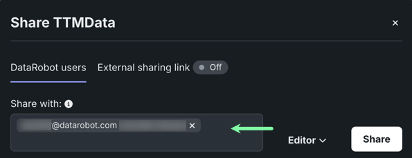 Add all of the email domains and addresses you want to be able to access the application. Note that the emails and domains must be formatted correctly (e.g., @datarobot.com) and only those listed here can access the app via the sharing link.