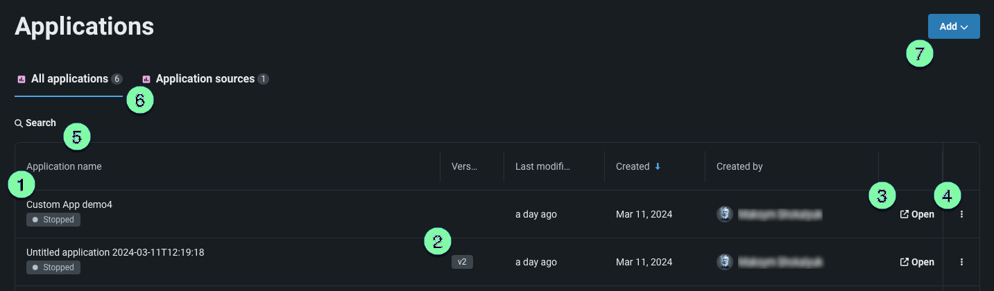| 7 | Add dropdown | Use the Add dropdown to upload a custom app or create a new application source. |