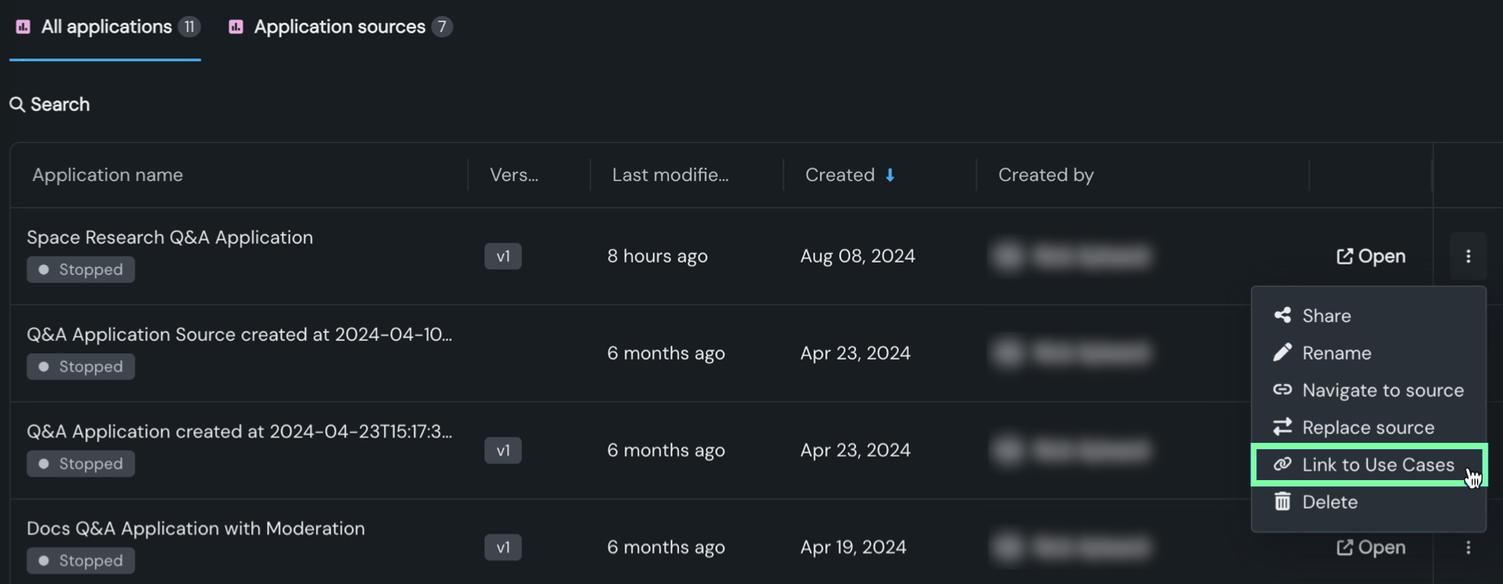 To link a custom application to a Workbench Use Case, in the application's actions menu , click Link to Use Cases: