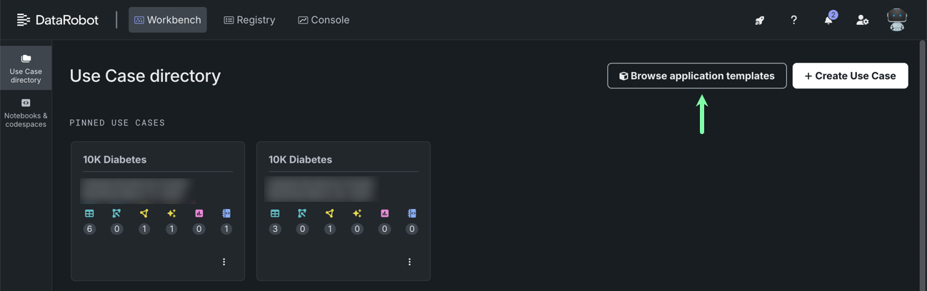 Use application templates to launch an end-to-end DataRobot experience. This can include aspects of importing data, model building, deployment, and monitoring. The templates assist you by programmatically generating DataRobot resources that support the use case. Application templates are customizable and consist of multiple components.