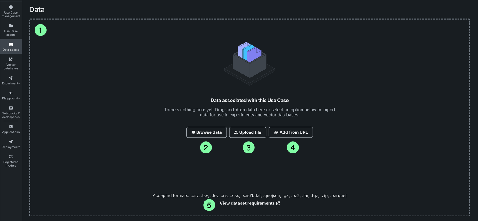 | 1 | Drag-and-drop | Drag-and-drop one or more datasets within the dotted lines to add them to the Use Case. See the accepted formats listed above View dataset requirements. |