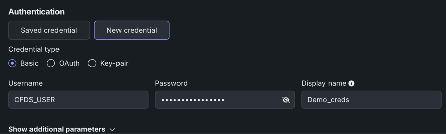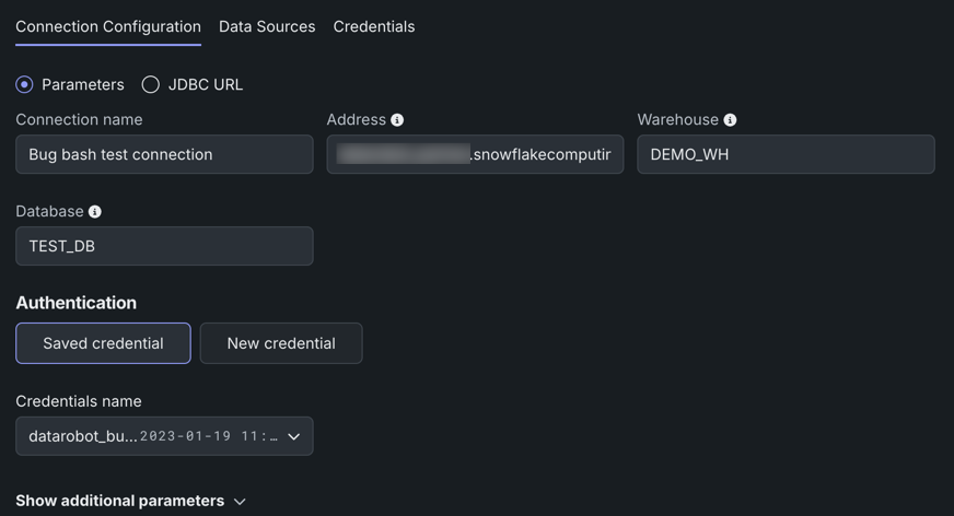 On the Connection Configuration tab, you can modify connection parameters, including adding new parameters and selecting or creating new credentials.
