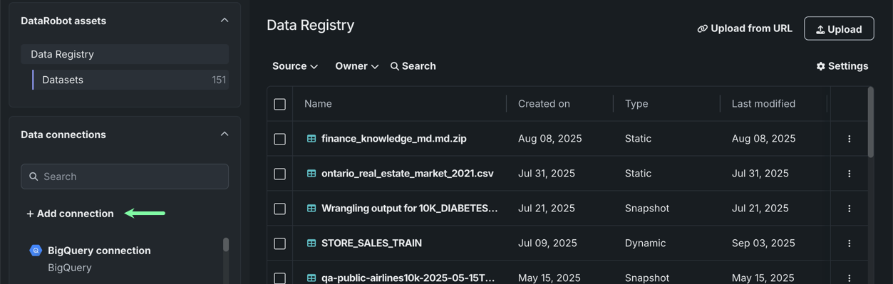 The Data Sources tab displays all data assets associated with the connection. This includes data that has been manually added via the data connection in addition to those that are automatically added whenever a dataset or file is added from the connection to the Data Registry or Use Case. From here, you can: