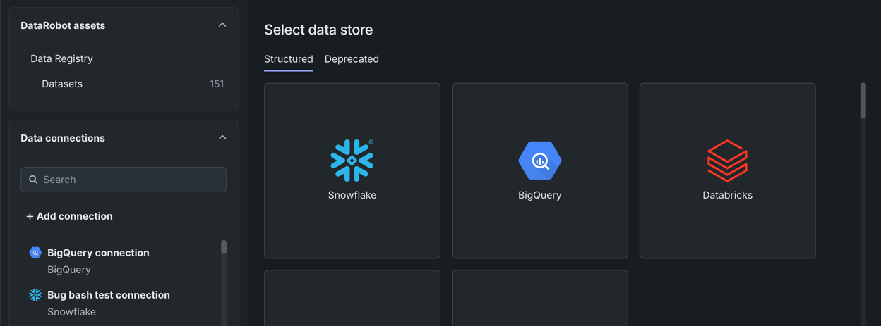 Choose either Structured for connections that support adding structured data, or Unstructured for connections that support unstructured data. Then, select a data store.