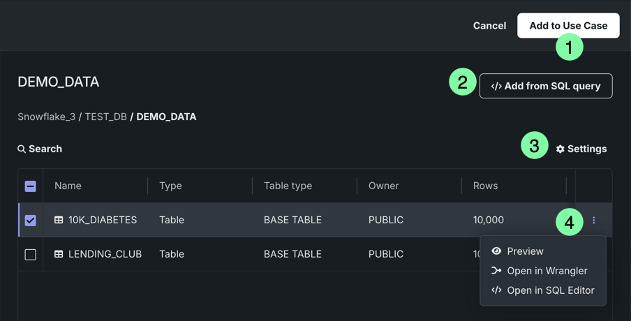 Element Description 1 Add to Use Case Adds the data asset to your Use Case, making it available to you and other team members. 2 Add from SQL query Allows you to use SQL queries to add data. 3 Settings Allows you to show, hide, and/or pin columns. 4 Actions menu Provides access to the following actions: - Preview: Open a snapshot preview to help determine if the dataset is relevant to your Use Case and/or if it needs to be modified in either Wrangler or the SQL Editor.
