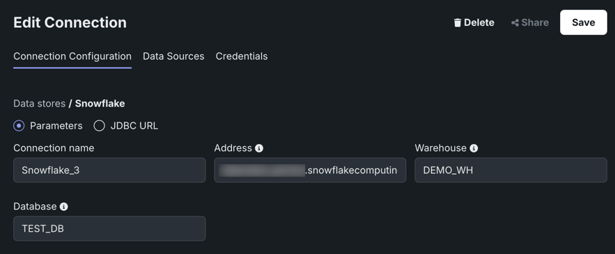 When configuring your data connection, configuration types, authentication options, and required parameters are based on the selected data source. The example below shows how to configure Snowflake with OAuth using new credentials.