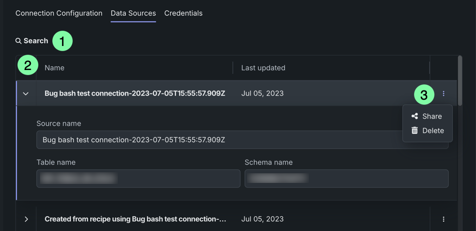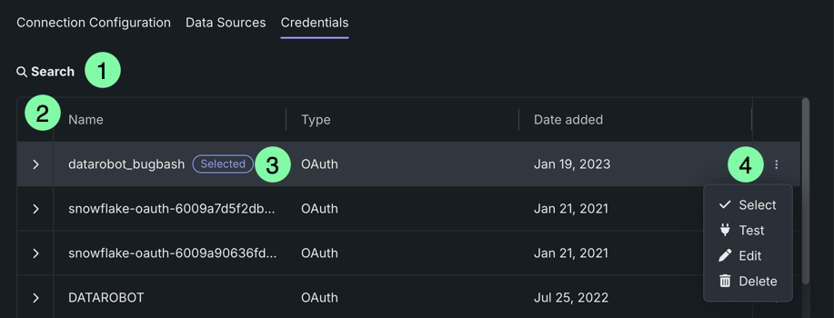 | 3 | Selected badge | Indicates the credentials currently in use by the data connection. |