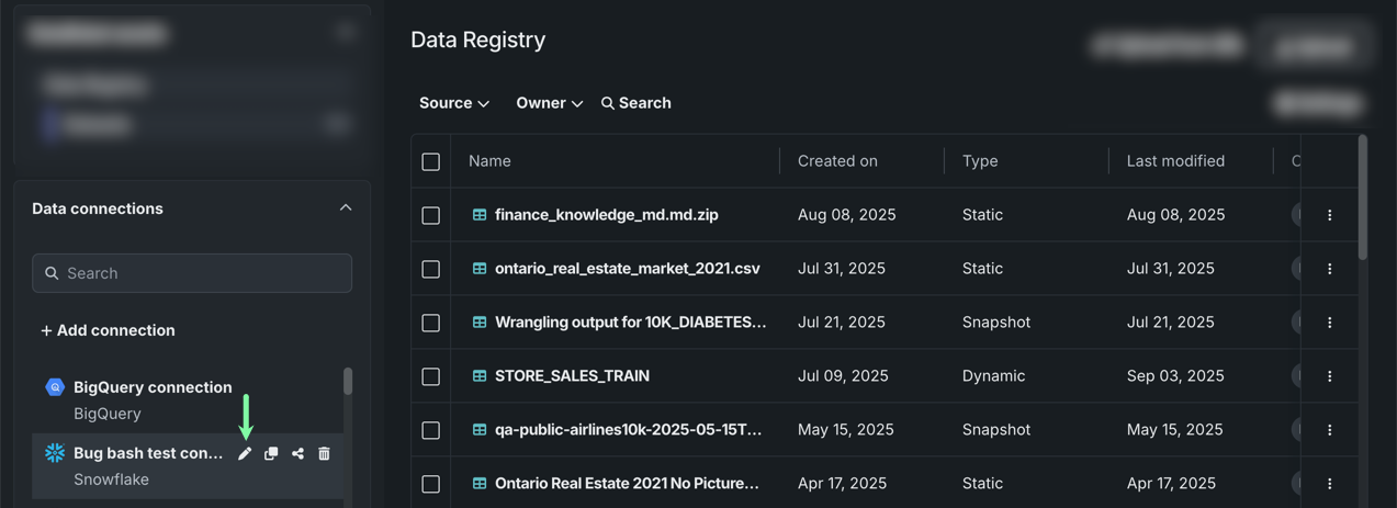 From the Browse data modal, you can modify existing data connections, including configuration parameters, as well as associated credentials and data sources.