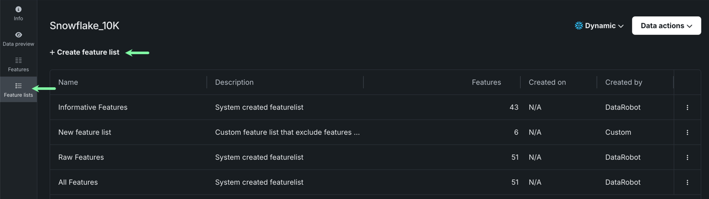 The Feature lists tile is a dedicated page where you can view, manage, and create custom feature lists. Use the insights generated during EDA1 to explore the available feature lists before choosing the appropriate one to use for modeling. You can use one of the automatically created lists—Informative and Raw—or create a custom feature list.