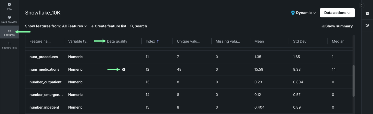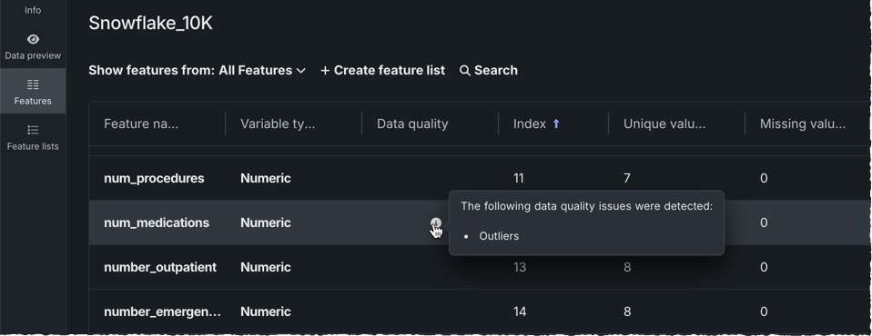 Open the Features tab on the left. The Data quality column indicates if DataRobot detected a data quality issue with the feature.