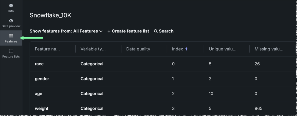 | Feature lineage | Provides a visual description of how the feature was derived and the datasets that were involved in the feature derivation process. | Feature Discovery datasets only |
