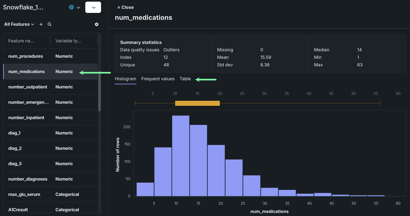 | Table | Provides a table of feature values and their occurrence counts. Note that if the value displayed contains a leading space, DataRobot includes a tag, leading space, to indicate as much. This is to help clarify why a particular value may show twice in the histogram (for example, 36 months and 36 months are both represented). | numeric, categorical, text, boolean, summarized categorical, multilabel |
