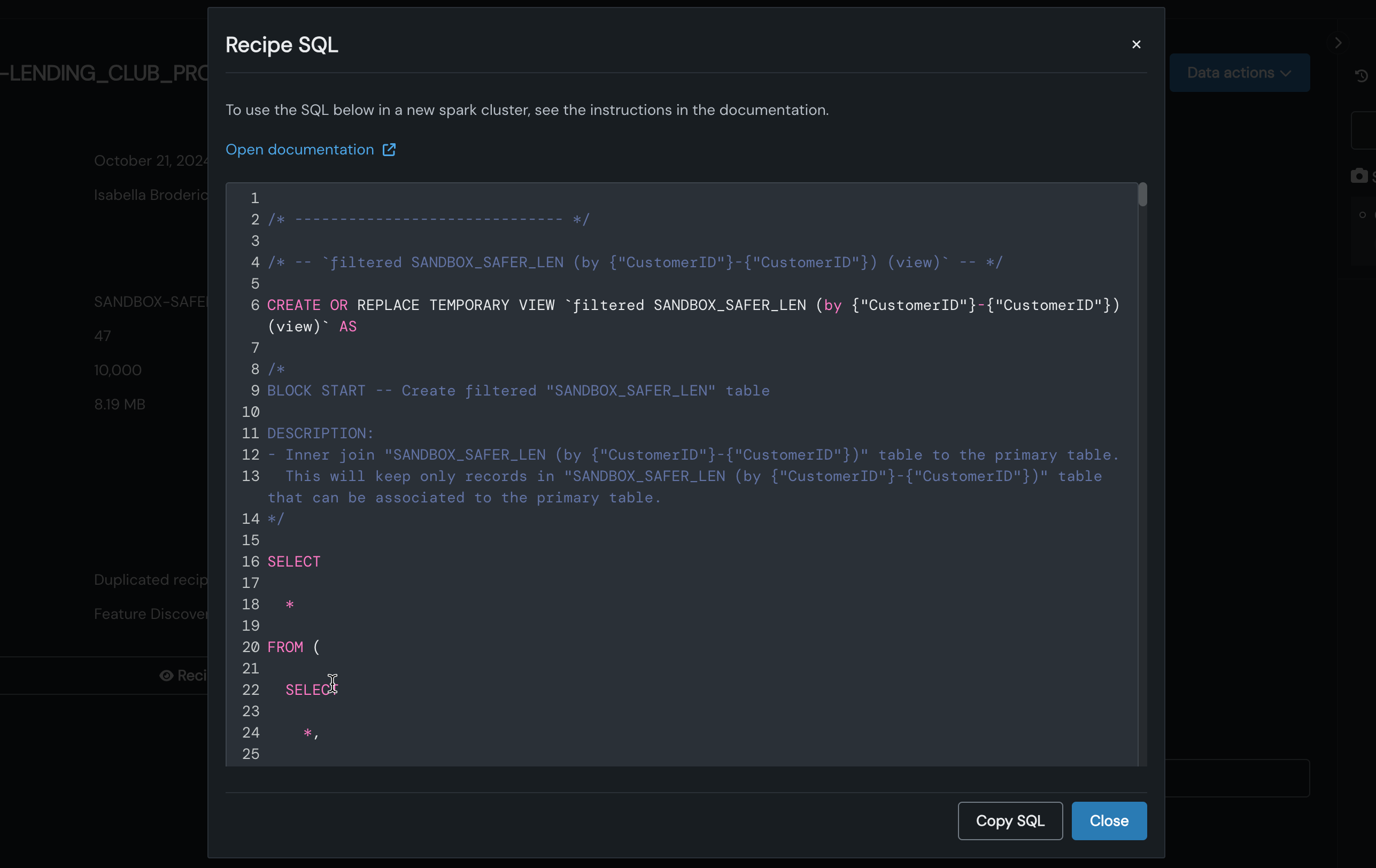 View the SQL to understand how DataRobot performed the joins and aggregations as part of Feature Discovery or copy the SQL to run the SQL in a new Spark cluster.