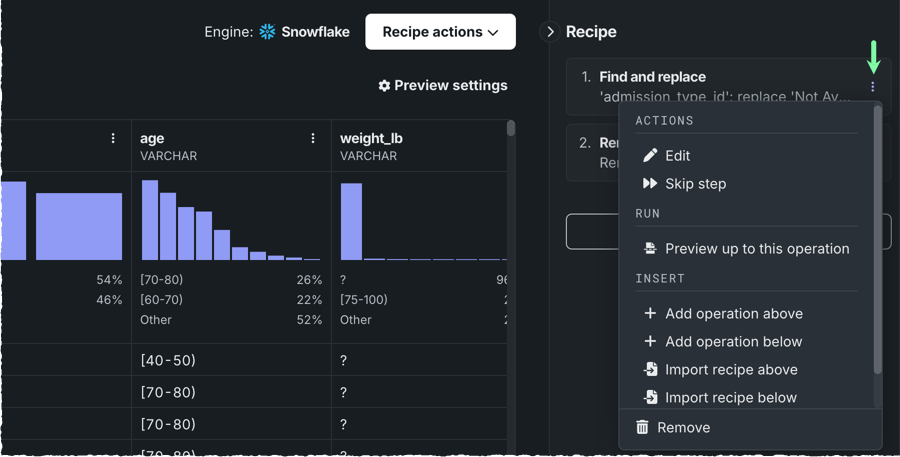 After adding an operation to the recipe, you can access the Actions menu to the right of individual operations, allowing you to: