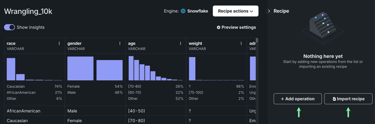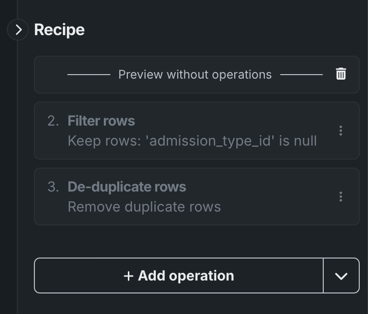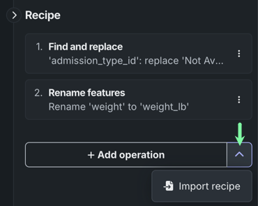 In the right panel, either click + Add operation to add individual transformations to your recipe, or Import recipe to import an existing recipe.