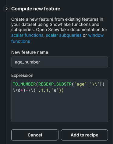 REGEXP_SUBSTR, to extract the first number from the[<age_range_start> - <age_range_end>)from theagecolumn, andto_numberto convert the output from a string to a number.Expression formatting