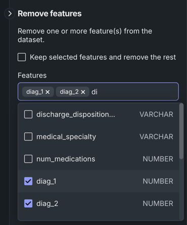 - If you select Feature, you must then click inside the field and select a dataset feature from the dropdown. DataRobot will compare the two features, returning all rows that meet the condition type based. For example, if the condition is