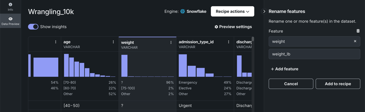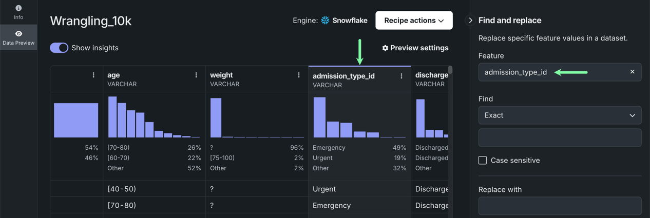 Under Select feature, click the dropdown and choose the feature that contains the value you want to replace. DataRobot highlights the selected column.