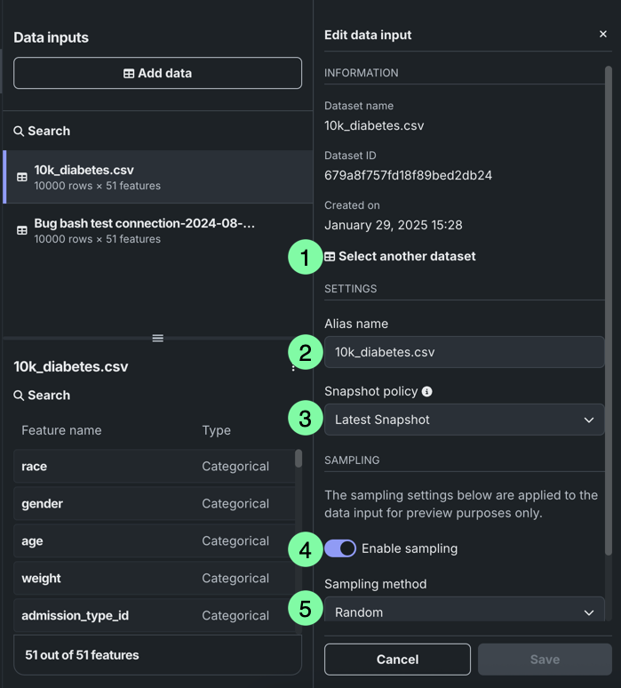 | 4 | Enable sampling | Use the toggle to turn sampling on or off for the data preview. If sampling is disabled, the full dataset is used for data previews. |
