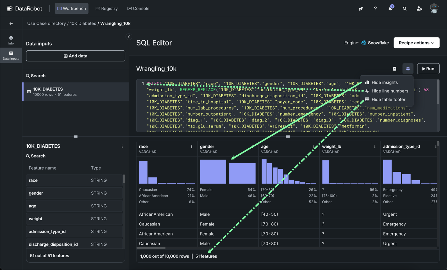 | 2 | Data inputs tab | Displays the data inputs and feature menu for associated with the SQL recipe. |