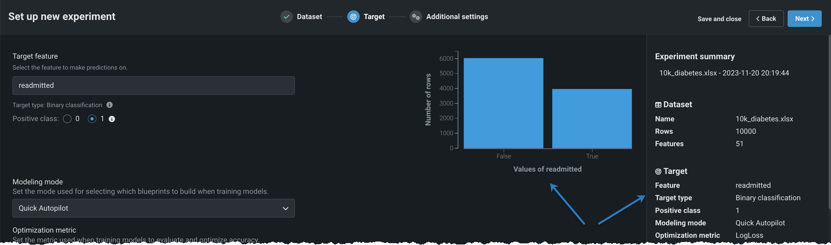 With a target selected, Workbench displays a histogram providing information about the target feature's distribution and, in the right pane, a summary of the experiment settings.