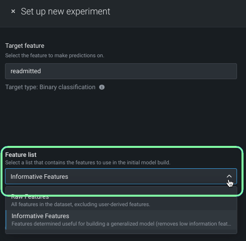 Feature lists control the subset of features that DataRobot uses to build models. Workbench defaults to the Informative Features list, but you can modify that before modeling. To change the feature list, click the Feature list dropdown and select a different list: