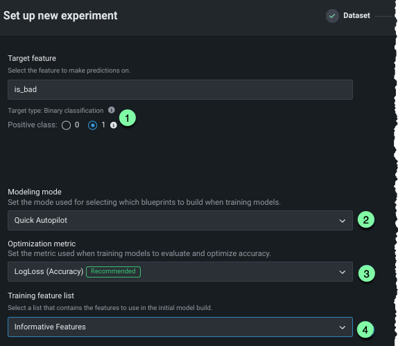 | 1 | Positive class | For binary classification projects only. The class to use when a prediction scores higher than the classification threshold. |