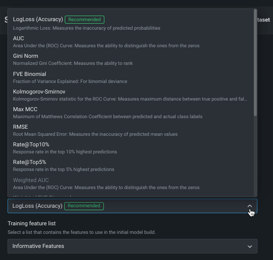 The optimization metric defines how DataRobot scores your models. After you choose a target feature, DataRobot selects an optimization metric based on the modeling task. Typically, the metric DataRobot chooses for scoring models is the best selection for your experiment. To build models using a different metric, overriding the recommended metric, use the Optimization metric dropdown: